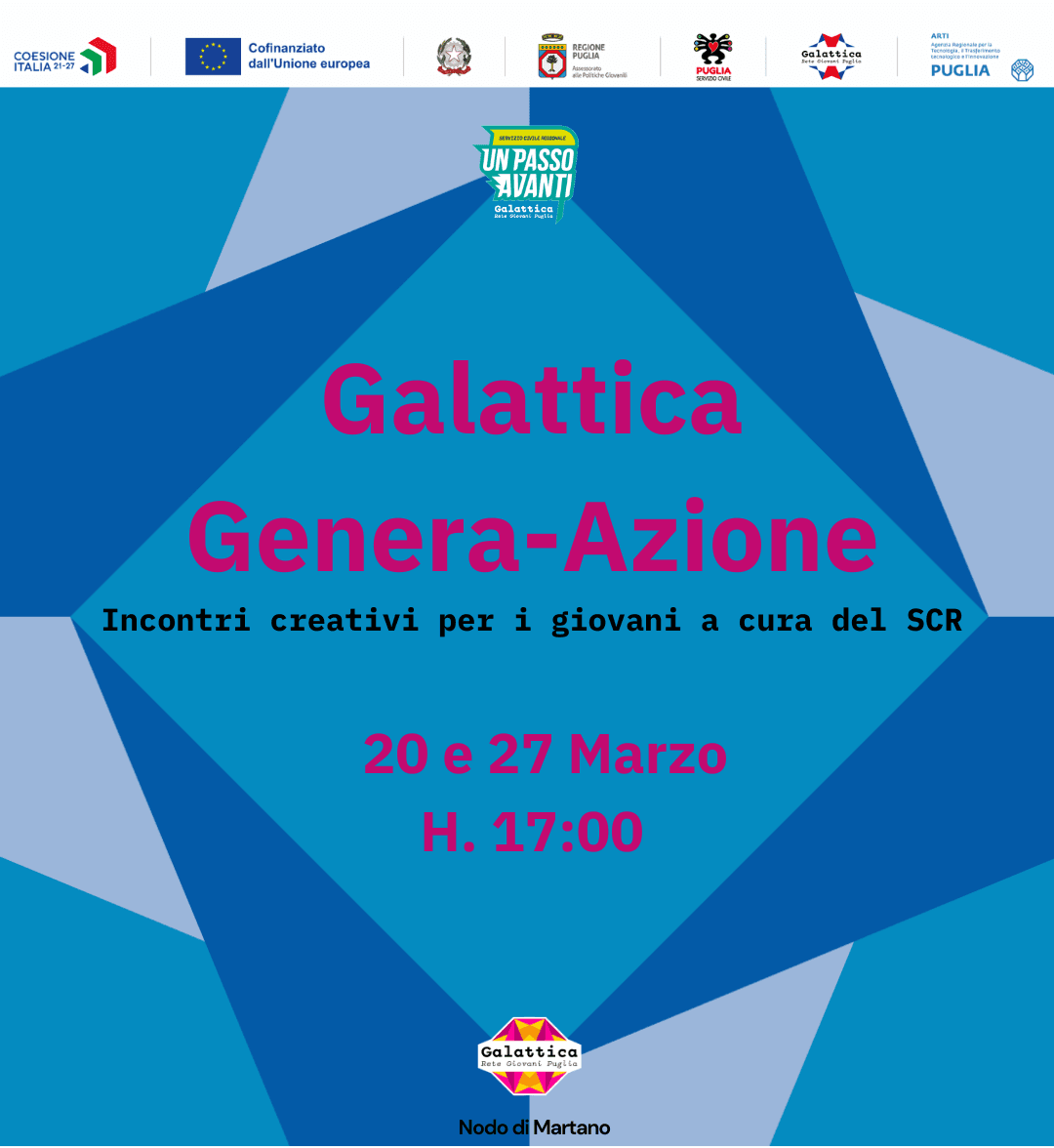 Il SCR di Martano, con Marika e Davide, propone per il mese di Marzo 2026 due nuovi incontri dell’iniziativa Galattica GenerAzione per CREARE, GIOCARE, STARE INSIEME, SOCIALIZZARE, FARE GRUPPO… tra i giovani del paese e dei Comuni limitrofi!
