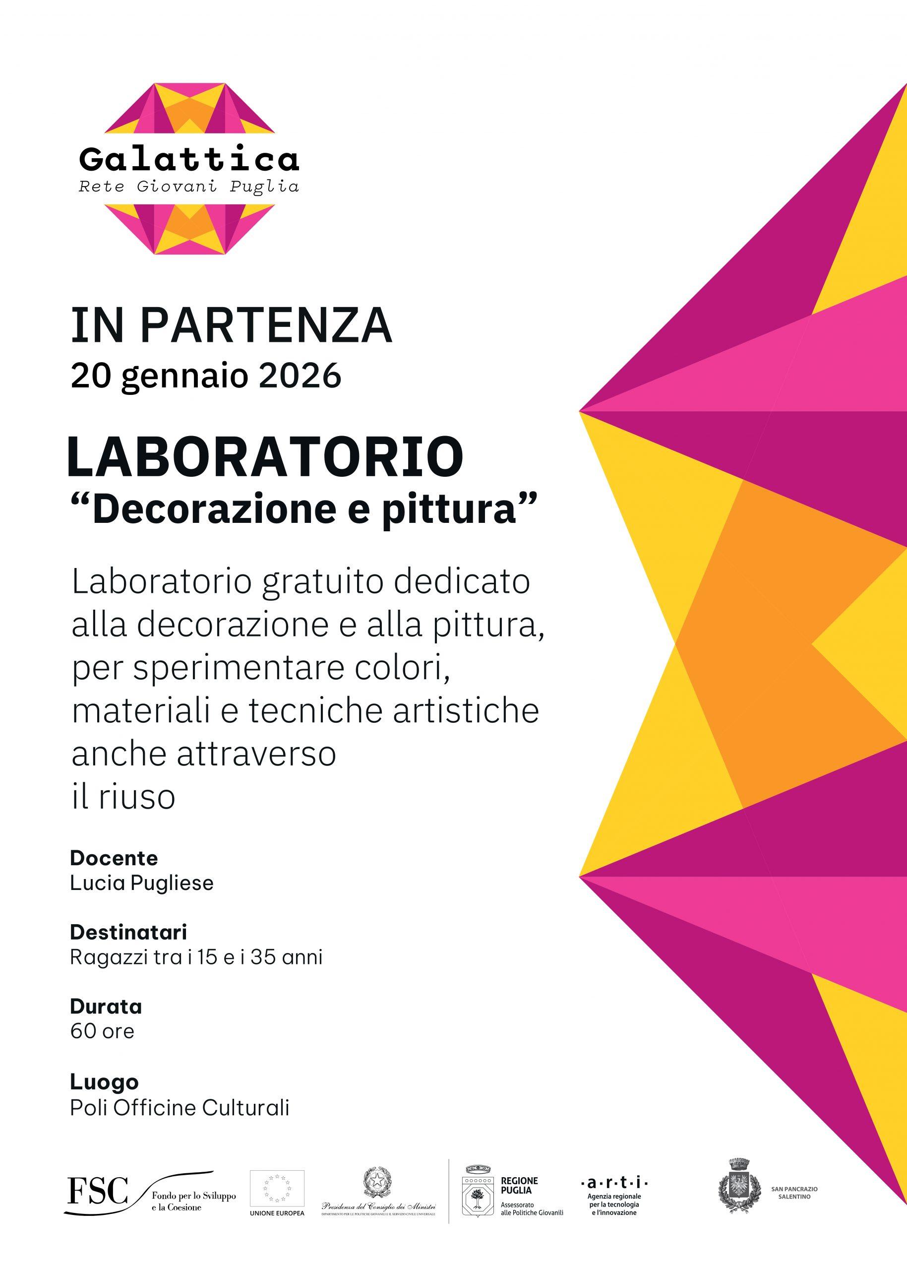 Il laboratorio fa parte delle attività gratuite di Galattica – Rete Giovani Puglia, progetto della Regione Puglia – Sezione Politiche Giovanili e di ARTI Puglia, realizzato dal Comune di San Pancrazio Salentino.