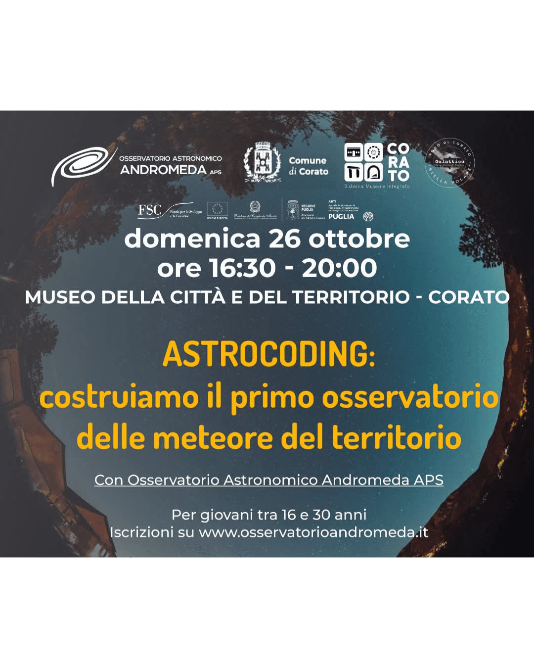 Nella settimana europea della programmazione e nell’ambito del programma “Aspettando i 15 anni di Osservatorio Andromeda” 🚀 presso il Museo della Città e del Territorio di Corato, in collaborazione con il Sistema Museale Integrato Corato – SMICO e con il supporto di GALATTICA CORATO, avvia ASTROCODING un laboratorio didattico di programmazione per l’astronomia in cui i giovani potranno prototipare una stazione per il monitoraggio delle meteore!