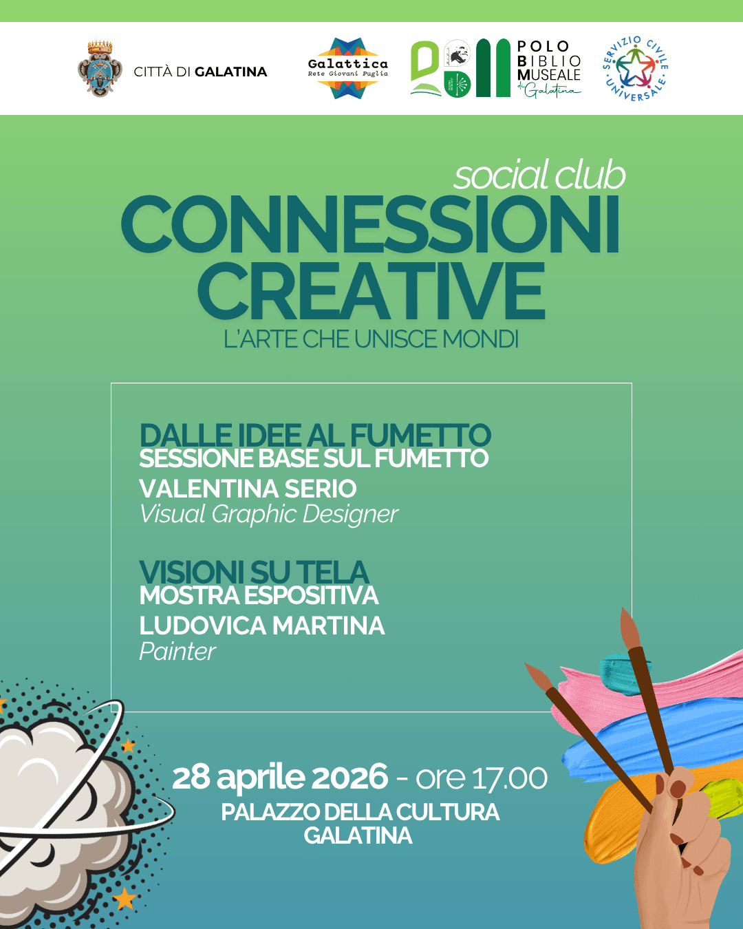 Il Nodo Galattica di Galatina organizza il secondo appuntamento del Social Club con “Connessioni Creative – L’arte che unisce mondi”, un pomeriggio dedicato all’esplorazione dei linguaggi artistici.