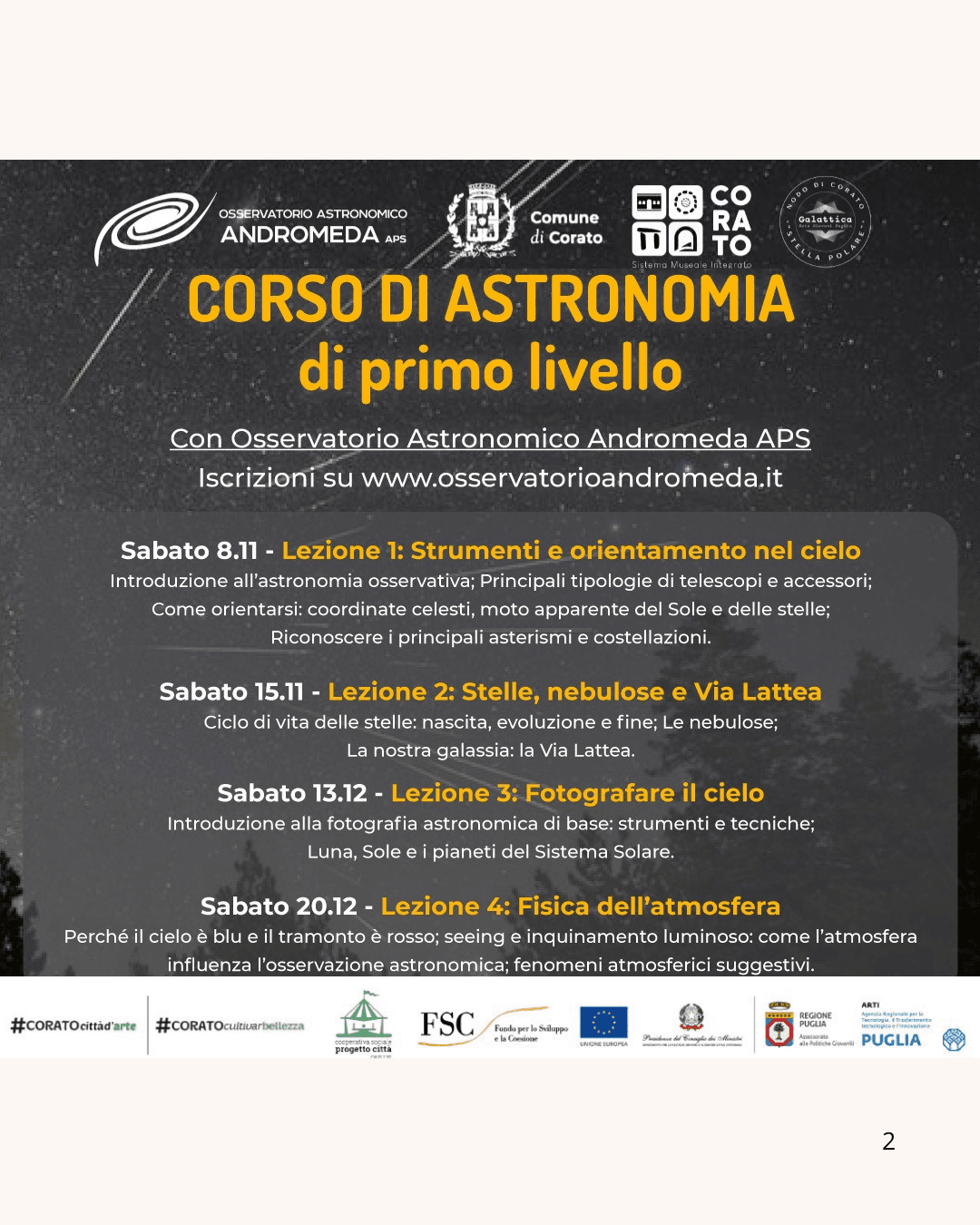 Grazie all’ Osservatorio Astronomico Andromeda presso il Museo della Città e del Territorio di Corato, in collaborazione con il Sistema Museale Integrato Corato – SMICO e con Galattica Corato “Stella Polare“, nelle giornate indicate, sarà attivo un Corso base di primo livello strutturato e diviso in quattro giornate.
