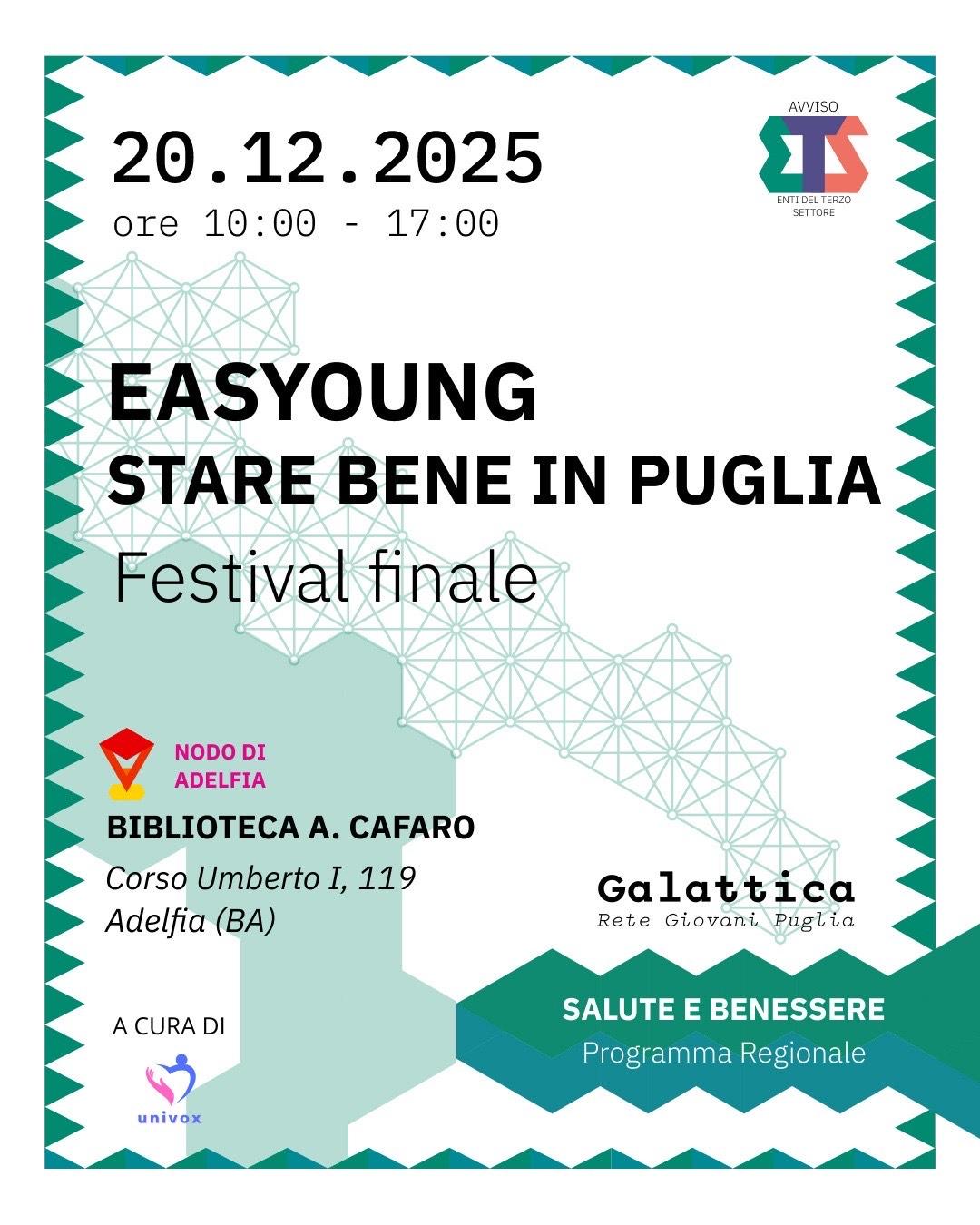 🎉 Il Festival #Easyoung raddoppia! Oltre alla giornata di Bari, ci sarà un secondo appuntamento speciale dedicato a chi vuole vivere da vicino la conclusione del percorso Easyoung e tutto ciò che ha permesso di creare. 📍 Questa volta saremo nel nodo di Adelfia, presso la Biblioteca Comunale Antonio Cafaro 📌 Corso Umberto I, 119 📅 20 Dicembre | 10:00 – 17:00 Sarà una giornata aperta e ricca di momenti di confronto, creatività e condivisione. 💚 Ti aspettiamo! #StareBeneInPuglia #FestivalEasyoung #Univox #Adelfia