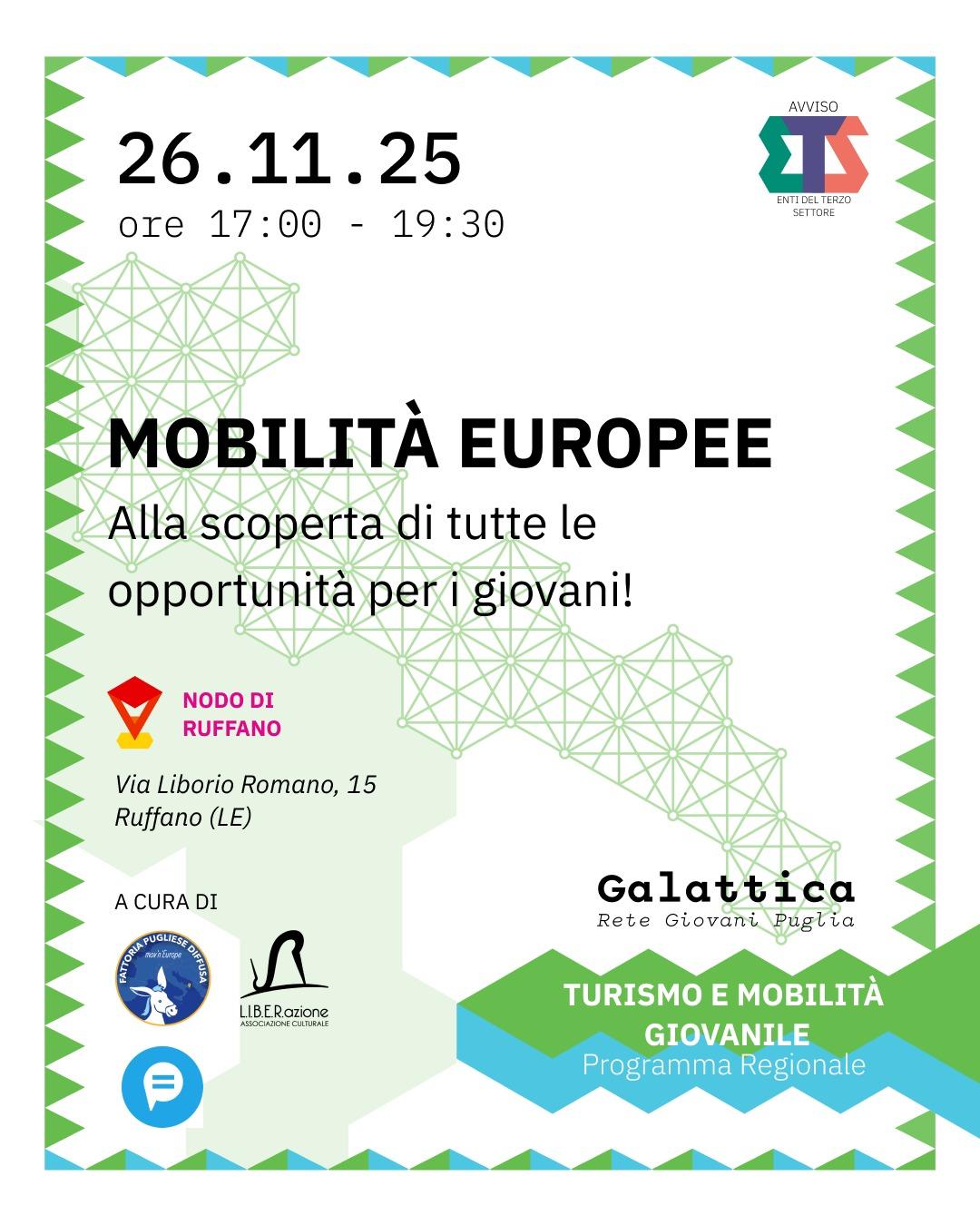 Mercoledì 26 novembre, presso il Nodo Galattica di Ruffano, in via Liborio Romano 15, esploreremo ancora le opportunità offerte dalle mobilità europee.