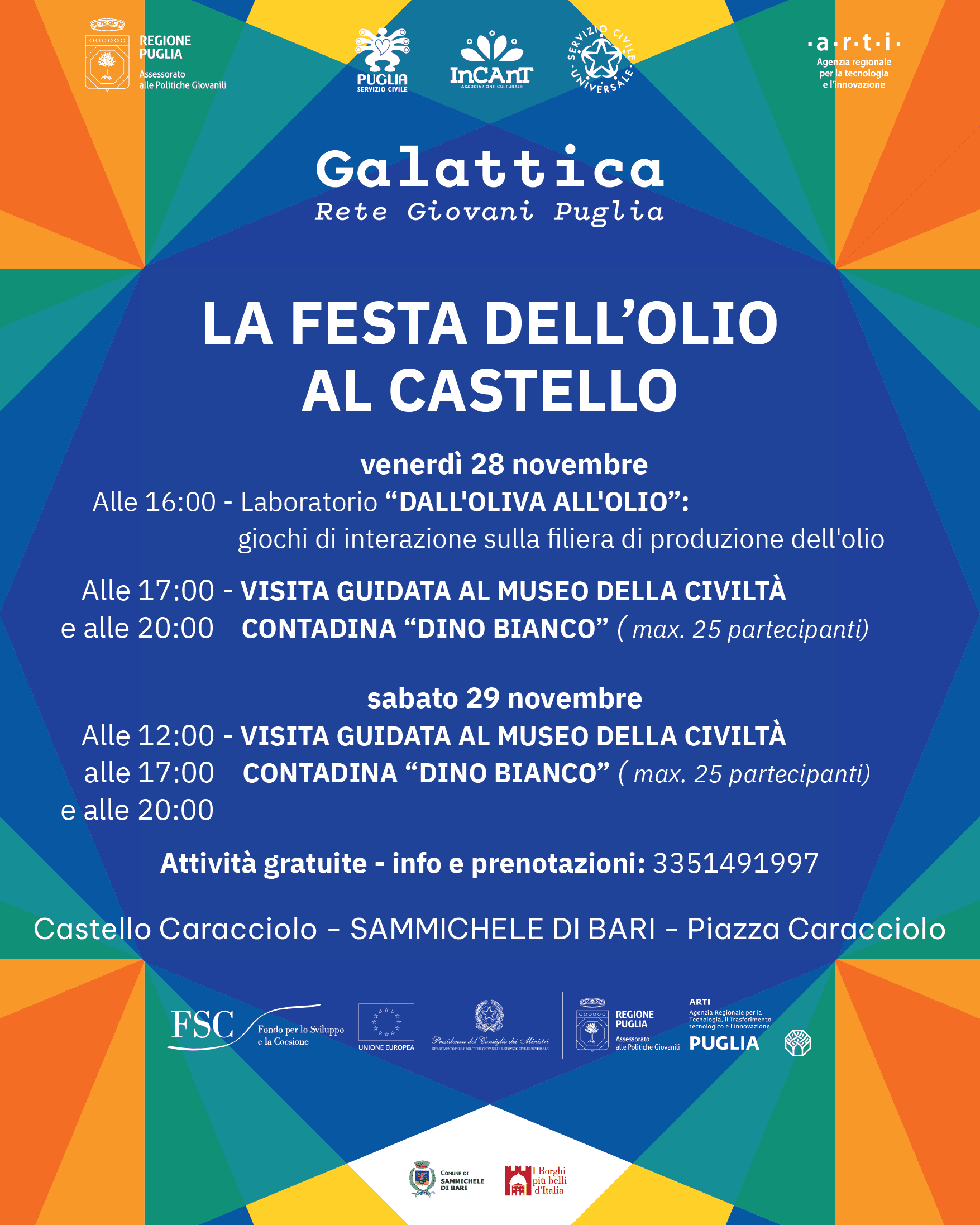 In occasione della quinta edizione della Festa dell’Olio, promossa dall’amministrazione comunale di Sammichele di Bari, con il patrocinio della Regione Puglia, il Castello Caracciolo ospiterà attività di alto profilo esperienziale e conoscitivo di un prodotto da sempre definito pilastro della civiltà contadina.