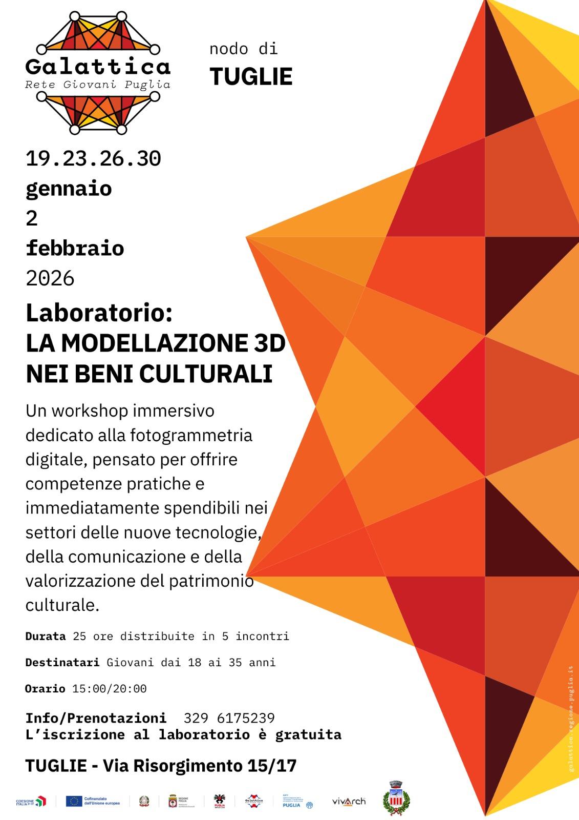 Un workshop immersivo dedicato alla fotogrammetria digitale, pensato per offrire competenze pratiche e immediatamente spendibili nei settori delle nuove tecnologie, della comunicazione e della valorizzazione del patrimonio culturale.Attraverso attività laboratoriali e lavoro di gruppo, i partecipanti apprenderanno il processo completo di creazione di modelli 3D low cost, dalla raccolta dei dati all’elaborazione digitale, fino alla loro applicazione in contesti reali.