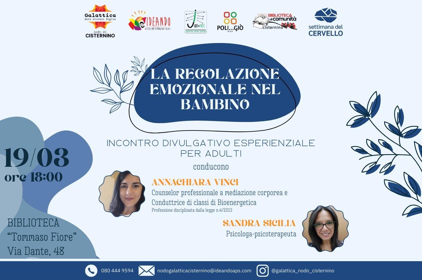 Giovedì 19 Marzo alle ore 18:00, presso la Biblioteca Comunale “Tommaso Fiore”, avrà luogo l’evento “La Regolazione Emozionale nel Bambino” con Annachiara Vinci e la Dott.ssa Sandra Sicilia.