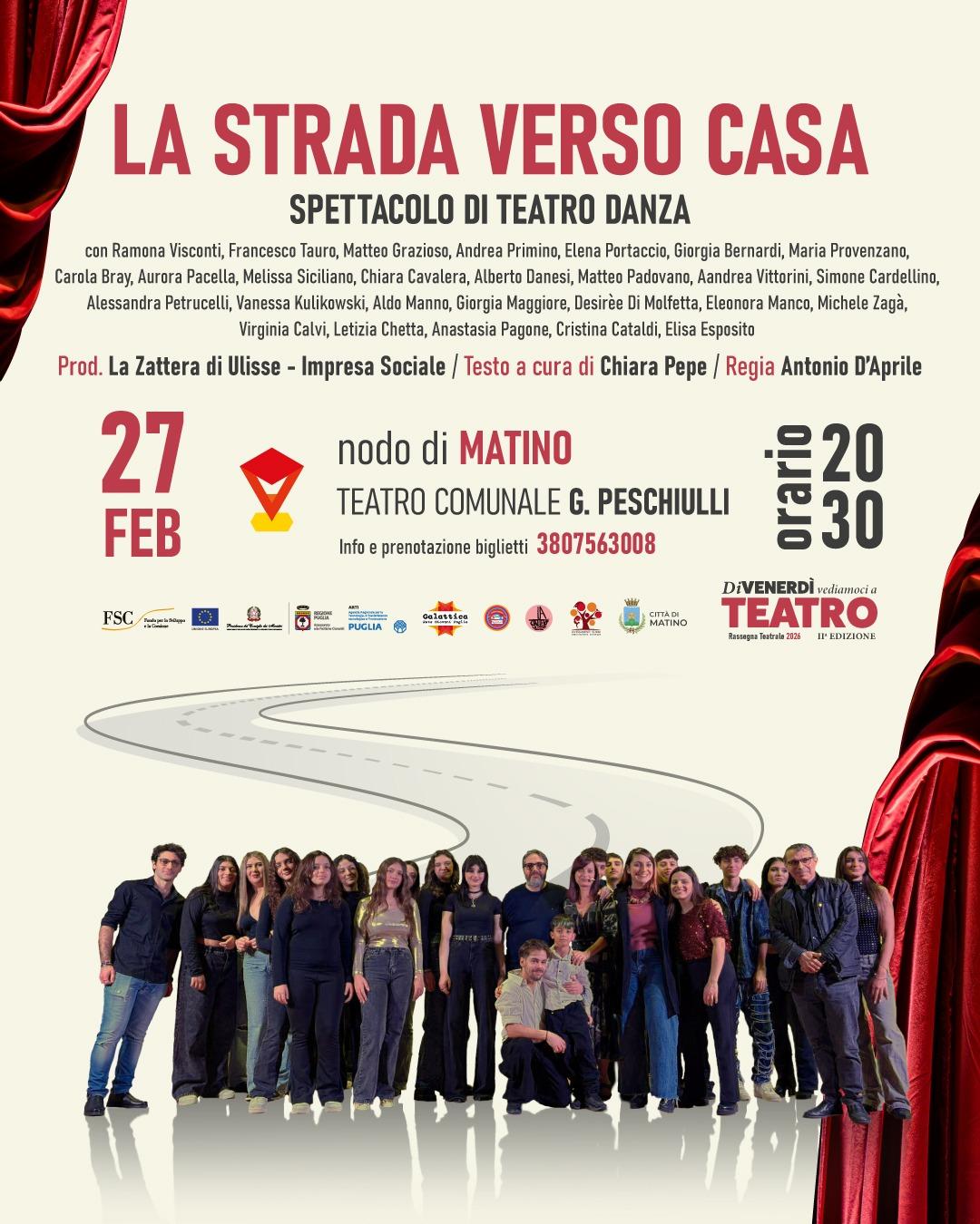 “La strada verso casa” nasce come restituzione del progetto “Sulla buona strada”, vincitore dell’Avviso Galattica Rete Giovani Puglia, per l’Ambito Salute e Benessere. Uno spettacolo frutto di una riflessione intensa sulle dipendenze patologiche e sul loro potere distruttivo nelle relazioni e nella vita, soprattutto dei giovani. Una regia visionaria, quella di Antonio D’Aprile, in cui musica, movimenti e parole si intrecciano per dar vita ad un racconto emozionante e intimo. Protagonisti in scena, gli studenti e studentesse del Liceo Quinto Ennio di Gallipoli.