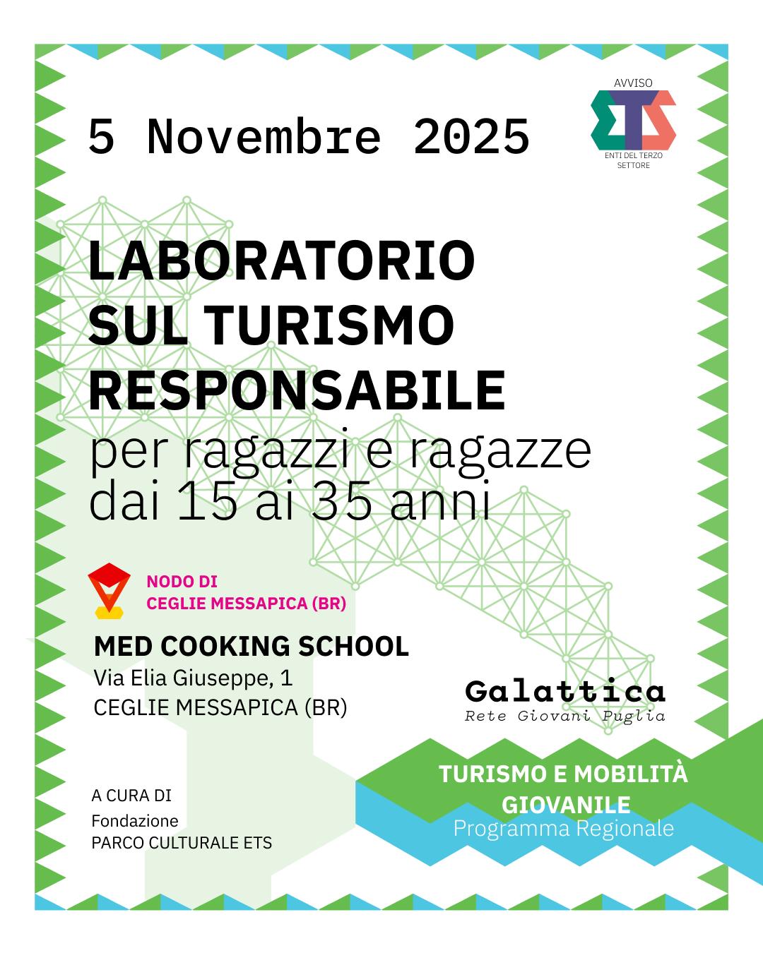 Il 5 novembre 2025 parte a Ceglie Messapica il Laboratorio gratuito di Turismo Responsabile, rivolto a ragazze e ragazzi tra i 15 e i 35 anni, presso la Med Cooking School, nodo Galattica della città.