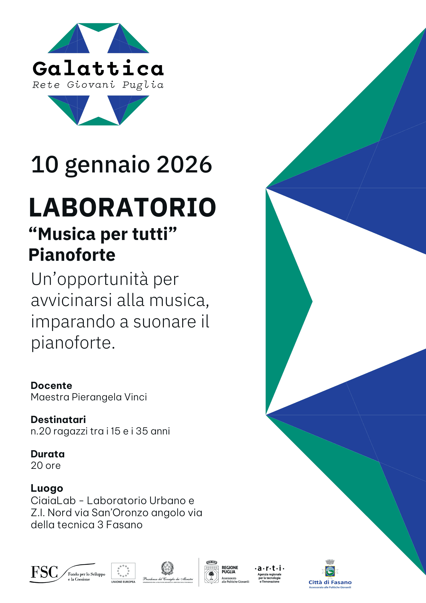🎹 Sabato 10 gennaio 2026 ha inizio un nuovo laboratorio gratuito a Fasano con il progetto Galattica: “Musica per tutti”-Pianoforte!Hai sempre voluto imparare a suonare uno strumento musicale e il pianoforte ti ha sempre incuriosito? Con questo laboratorio potrai scoprire o far crescere la tua passione per la musica.Seguiti dalla maestra Pierangela Vinci, infatti, i partecipanti impareranno a suonare il pianoforte partendo dalle basi.✅ Il laboratorio è rivolto ai giovani tra i 15 e i 35 anni del territorio di Fasano e si svolgerà il sabato mattina dalle 9:00 alle 11:00.Iscrizioni ancora aperte! Clicca sul link per iscriverti: docs.google.com/forms/d/e/1FAIpQLSck3d5U0jzbplUA07MTC1KFsn0jUv7WThkLTKaNLuVC4fvYNg/viewformOppure ti aspettiamo al Nodo di Fasano, il CiaiaLab – Laboratorio Urbano in C.so Vittorio Emanuele 76 a Fasano.Galattica è un progetto a cura della sezione Politiche Giovanili Puglia e ARTI Puglia, realizzato dall’Amministrazione Comunale di Fasano e dedicato ai giovani del territorio.#pugliagalattica