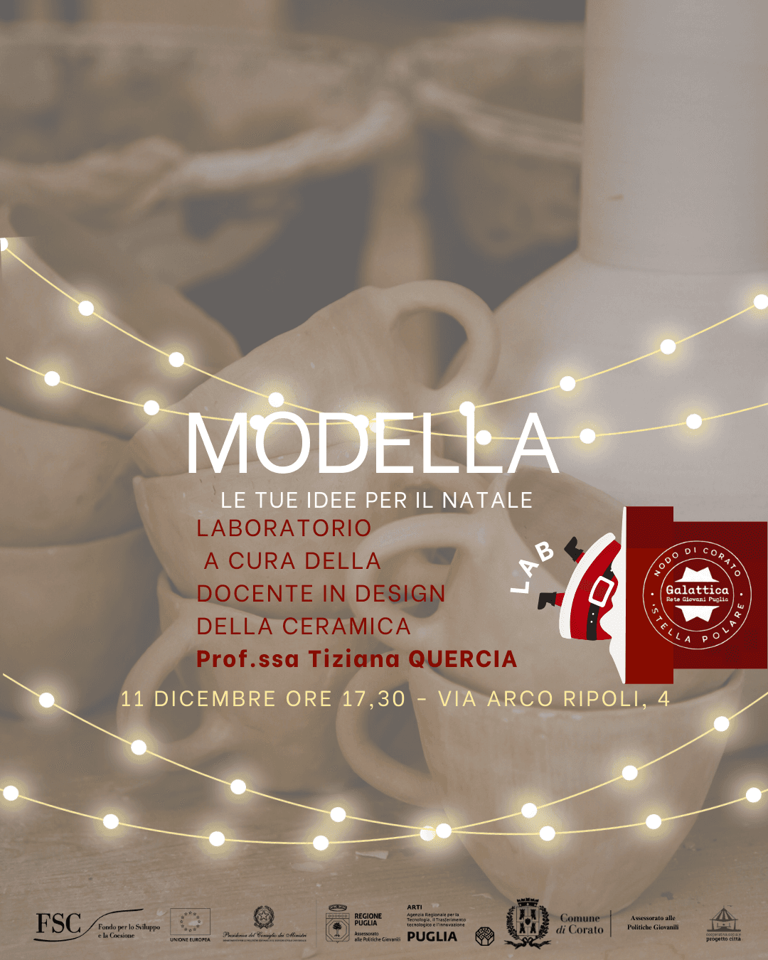 A Galattica Corato la creatività prende vita in un laboratorio pensato per sperimentare e sperimentarsi in un processo manuale guidato dalla Docente di Design della ceramica, Prof.ssa tiziana Quercia, che introdurrà le tecniche di base per la lavorazione del Das terracotta.