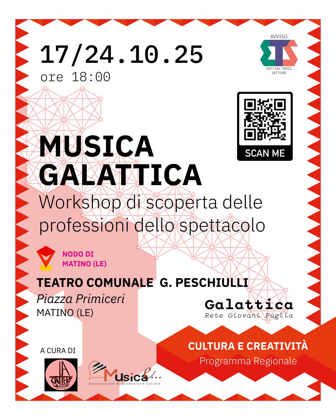 Il 17 e il 24 Ottobre 2025, il Nodo Galattica di Matino ospiterà i due appuntamenti di “Musica Galattica”, workshop di scoperta delle professioni dello spettacolo, a cura di “Musica e… APS”. Questa attività rientra nel Piano Regionale Galattica Rete Giovani Puglia, ambito CULTURA E CREATIVITA’. Il percorso laboratoriale si concluderà il 31 ottobre, con uno concerto finale. Tutti e tre gli appuntamenti, gratuiti, si terranno presso il Teatro Comunale “G.Peschiulli” di Matino, in collaborazione con La Zattera di Ulisse – Impresa Sociale.