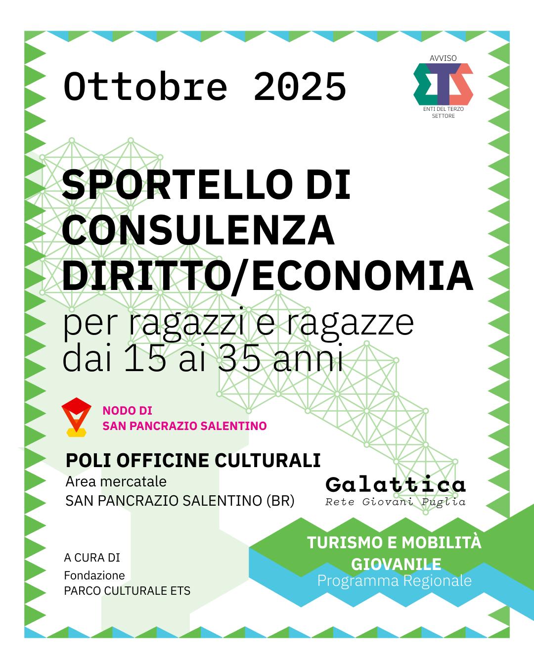 Presso il Poli Officine Culturali, nodo Galattica di San Pancrazio Salentino, è in attivazione lo Sportello gratuito di consulenza in ambito giuridico ed economico, dedicato a ragazze e ragazzi tra i 15 e i 35 anni.