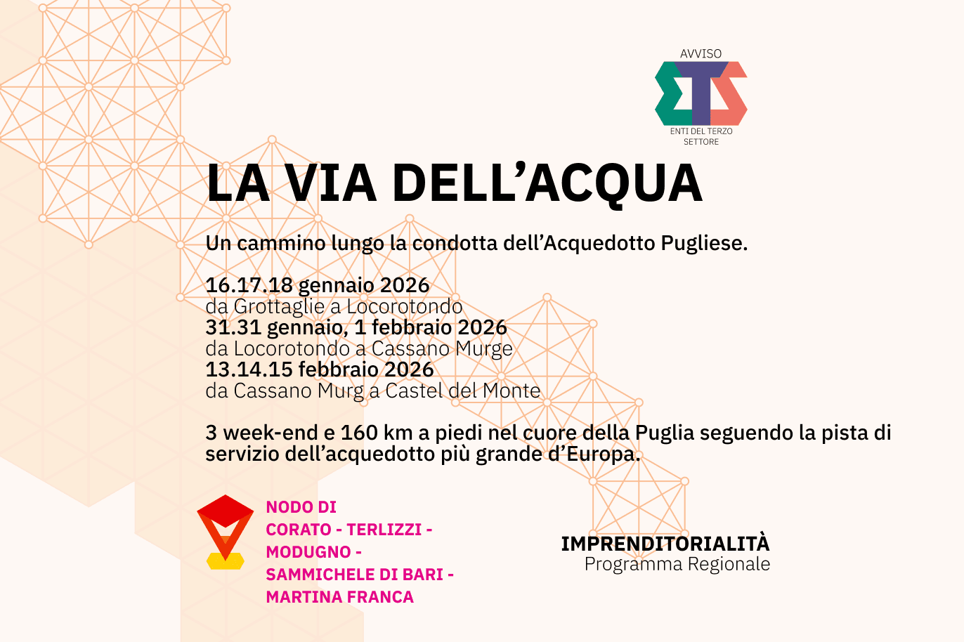 📅 I weekend di cammino: 1️⃣ 16-18 Gennaio: Da Grottaglie a Locorotondo (San Marco) 2️⃣ 30 Gen-1 Feb: Da Locorotondo a Cassano delle Murge 3️⃣ 13-15 Febbraio: Da Cassano al gran finale di Castel del Monte