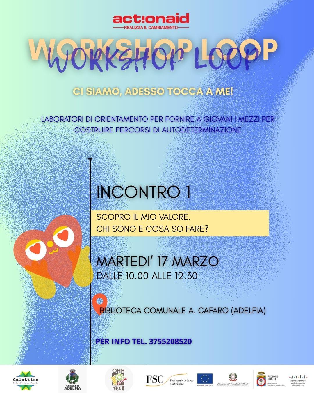 WORKSHOP LOOP – Ci siamo, adesso tocca a me! Parte il percorso Workshop Loop, un ciclo di laboratori di orientamento pensato per offrire ai giovani strumenti utili per conoscersi meglio e costruire il proprio percorso di autodeterminazione. Questo primo incontro segna l’inizio di un percorso fatto di appuntamenti e momenti di confronto importanti, pensati per aiutare i partecipanti a scoprire il proprio valore e le proprie capacità. 📍 Incontro 1 – Scopro il mio valore Chi sono e cosa so fare? 🗓 Martedì 17 marzo 🕙 Dalle 10:00 alle 12:30 presso la biblioteca comunale A. Cafaro (Adelfia) Un primo passo per mettersi in gioco, riflettere su sé stessi e iniziare a immaginare il proprio futuro. 💡 📞 Per info: 375 5208520