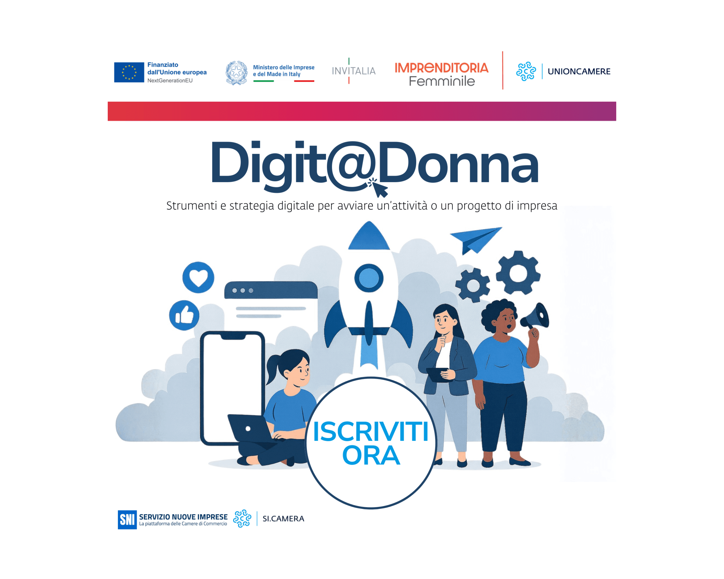 Digit@Donna è un percorso formativo gratuito rivolto a imprenditrci, studentesse, lavoratrici e alle donne che desiderano avviare una propria attività imprenditoriale.