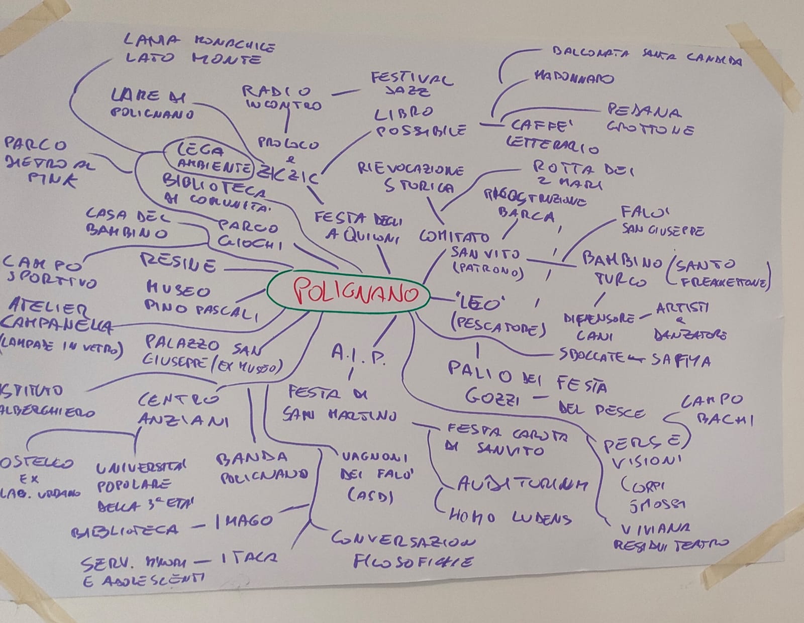 Mappare insieme il territorio ci ha resi più consapevoli del contesto in cui viviamo e di quante possibilità esso offra; è un terreno fertile su cui i giovani possono seminare per generare nuove opportunità per loro stessi e la comunità tutta. In un sabato pomeriggio di fine novembre abbiamo condiviso e rievocato storie e ricordi capaci di raccontare l’identità di un luogo e intere generazioni che lo abitano: antiche tradizioni, personaggi “storici”, eventi culturali e momenti di semplice collettività come il falò di San Giuseppe, la figura del Madonnaro, la Banda di Polignano a Mare, la festa di San Martino, il Festival Jazz, persino i “wuagnoni” del falò.