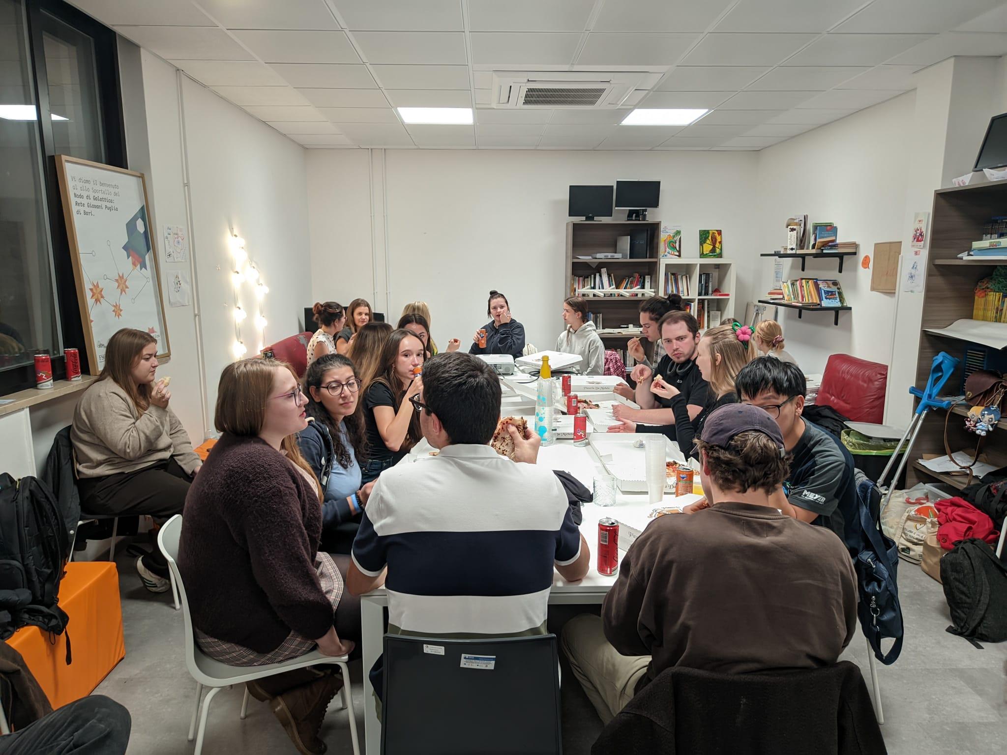 L’intercultural night è stata ospitata negli spazi del Nodo di Galattica così da far vivere al gruppo un’esperienza autentica di una comunità giovanile a Bari: cibi, musiche, racconti, un “benvenutə” detto in tanti modi diversi, ma con la stessa intenzione.